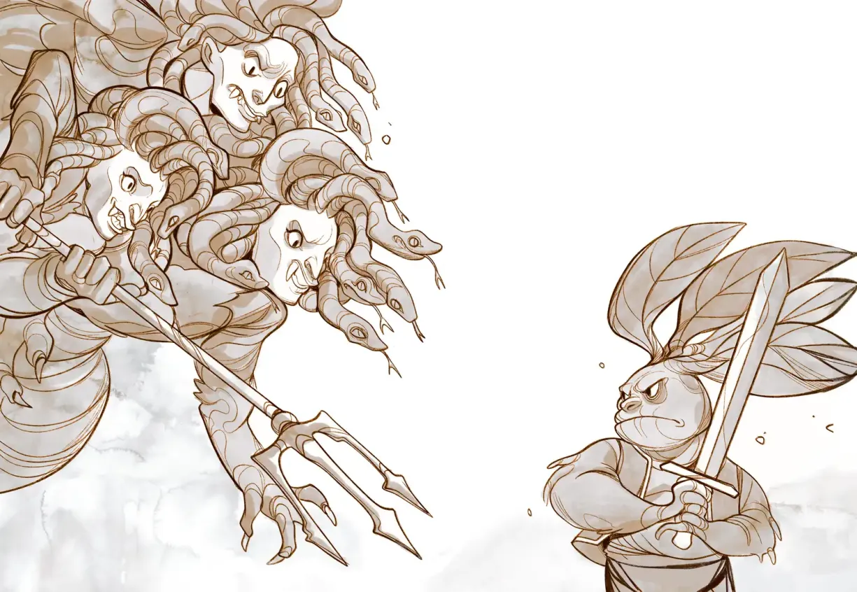 – Изчезвайте! Не се грижете за мен! – изрева Фидо към спътниците си, с мълниеносна бързина измъквайки меча, който сухо изсвистя и отсече китка коси-змии. Те се замятаха наоколо, търсейки нещо, в което да впият зъби. Джуджето се хвърли на земята и се превъртя няколко пъти по корем, избягвайки първото нападение. При това то успяваше да раздава кратки, но много ефективни удари със стоманеното острие, дори и от тая напълно неудобна позиция.