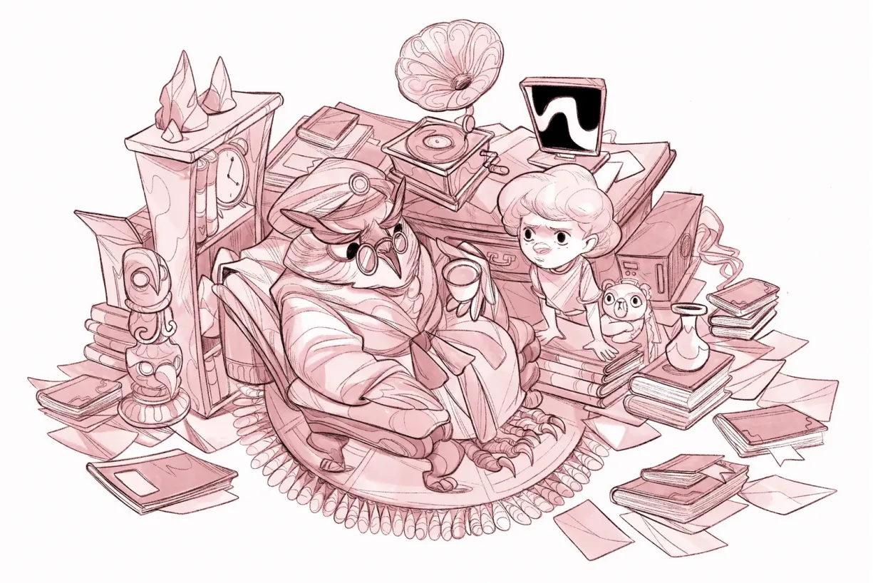 Домът на госпожа Бухалица е изпълнен с бъркотия и уют. Той е като стара библиотека, обърната на музей или склад. Всичко е разпиляно, но то си има собствена логика – скрита някъде под купчините книги, под часовниците и чашките.