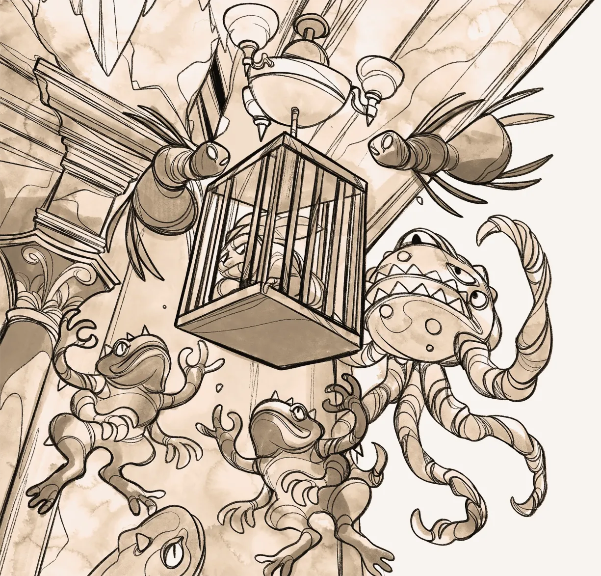 Предводителят-призрак пристъпи тежко напред, потропвайки по каменния под с многобройните си заострени нокти. После, в неочакван изблик на гняв той полетя нагоре, сграбчи кафеза и безмилостно го раздруса, при което Фидо заподскача вътре като гумено човече. На няколко пъти главата му изкънтя звучно при сблъсъка с железните пръти.