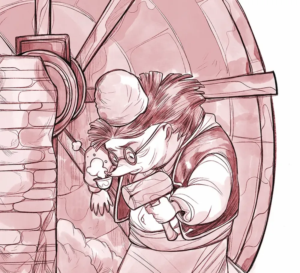 Ще ви дам един типичен пример. В развитието на историята има един ранен момент, в който Червенокоска се среща с Дядо Таралежко – един от основните герои, на когото предстои да участва в много други приключения, за които тогава нямах ни най-дребна идея, разбира се. Дядото е мил и благ старец (първообразът му е баща ми, Бог да го прости), който е изградил на брега на реката малка, но чудно хубава воденичка с голямо воденично колело. И, представете си, колелото се е запецнало. Каквото и да опитва старецът, то отказва да се завърти и това е.