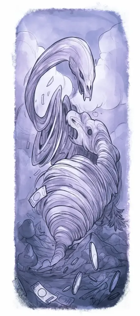 Преди обаче то да е успяло да се разгърне и укрепне, върху него се нахвърли много по-големият паричен смерч, обхвана го в хищна прегръдка и го задуши, без да му даде възможност да излезе извън кълбото. Червенокоска побледня от гняв.