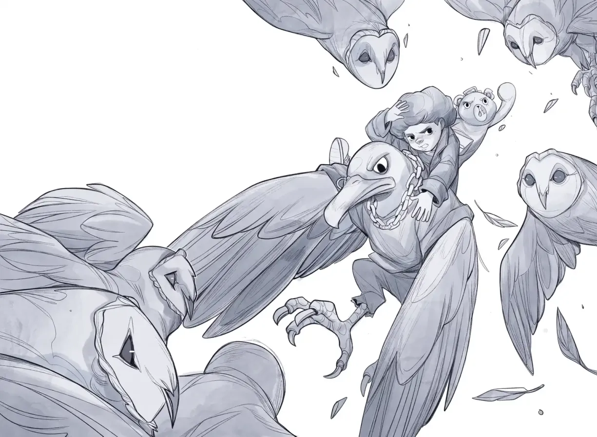 Може би това е най-кинематографичната сцена в цялата книга. Отчаяното въздушно бягство се превръща в ожесточена въздушна битка, нещо средно между „Междузвездни войни“ и „Хълмът Уотършип“. В сърцето на сцената лежи парадокс: Ането тъкмо е постигнала истинско чудо — освободила е всички свои приятели — но вместо радост и триумф следва кърваво сражение и появата на стар враг: свраката Меги.